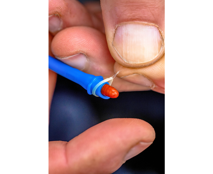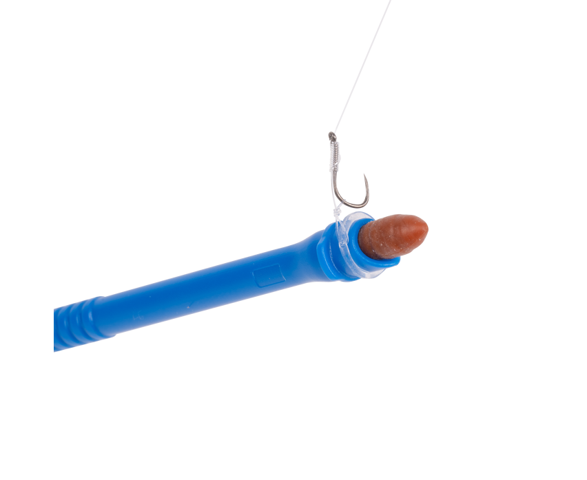 Wielofunkcyjne narzędzie z wypychaczem na jednym końcu i przyrządem do umieszczania przynęty w gumce na drugim. Przyrząd do umieszczania przynęty w gumce posiada wgłębienie, w które można wepchnąć przynęty, takie jak kastery lub pellet 4 mm, dzięki czemu można na nie z łatwością nasunąć gumkę.
